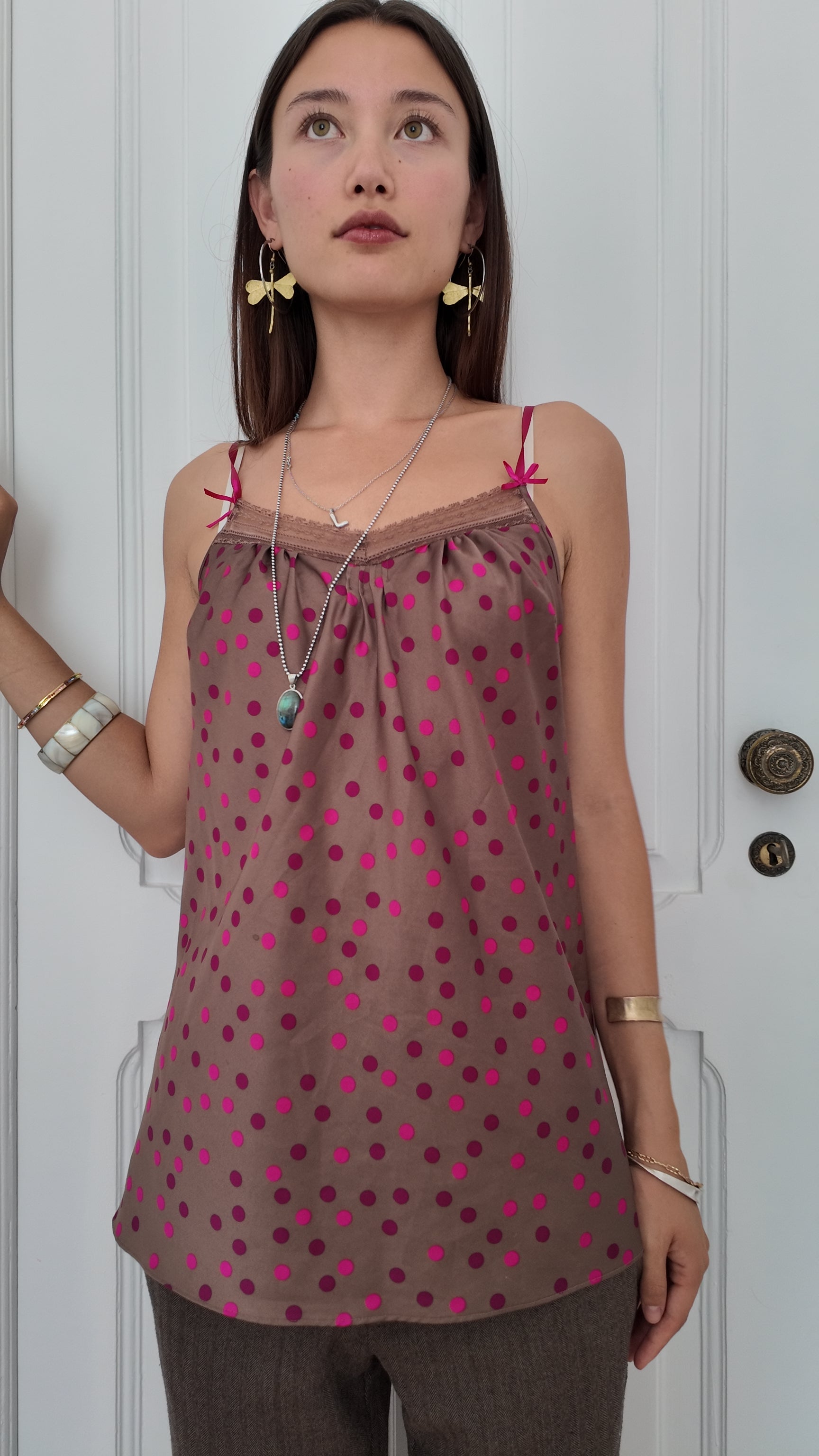 Adorable brown cami top with pink dots size M