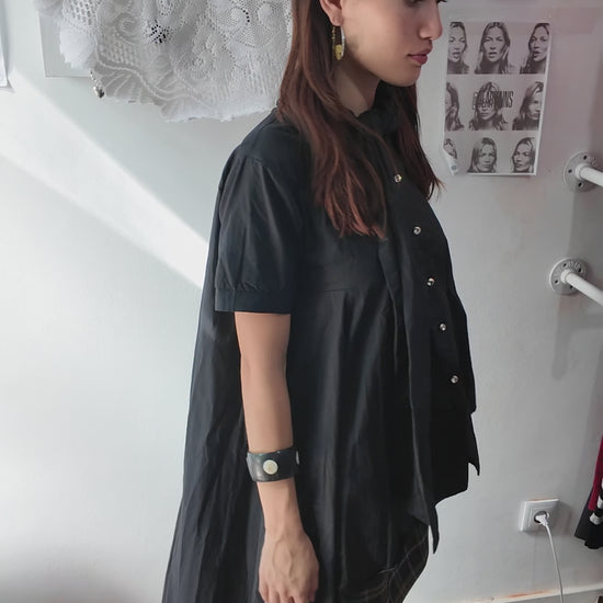 Elevate your wardrobe with this one-of-a-kind asymmetric black top in size S. Its unique silhouette offers a sleek, modern edge, perfect for making a refined statement at any event. Crafted for a flattering fit, this top combines minimalist elegance with contemporary design, ensuring you stand out with understated sophistication.